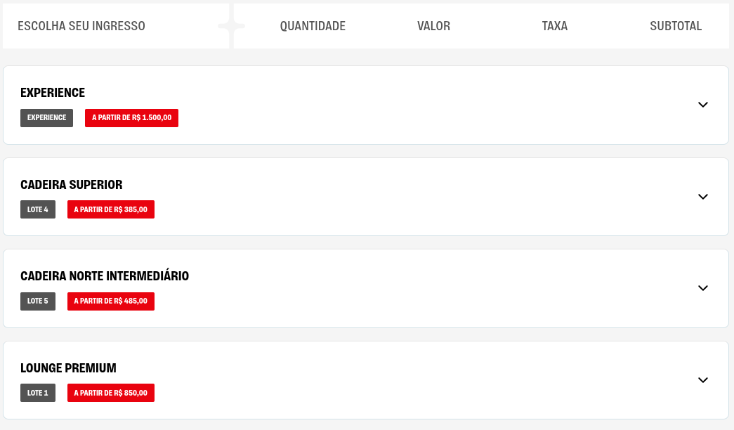 Esgotaram os ingressos para: Pista Premium; Pista; Cadeira Inferior Oeste; Cadeira Inferior Leste; e Cadeira Intermediária Leste.