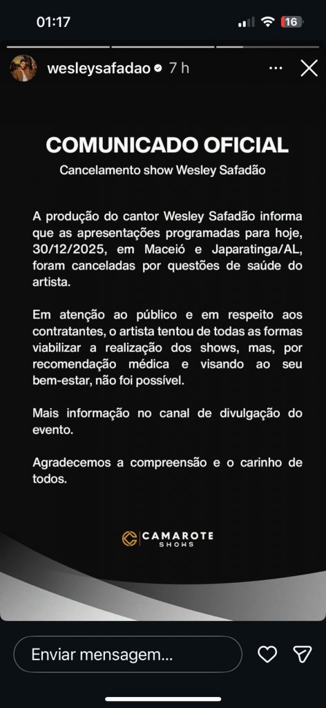 Três dias após a participação do cantor Wesley Safadão no Festival Virada Salvador 2026, o artista precisou cancelar os shows que seriam realizados nesta terça-feira (30), no Alagoas.