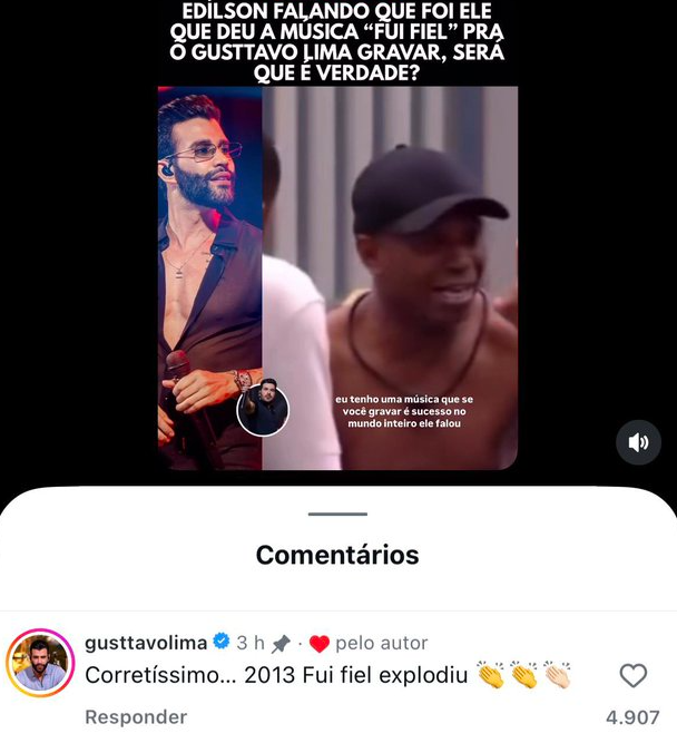 Apesar da situação com Escandurras, Gusttavo Lima confirmou a história contada pelo ex-jogador dentro do BBB: "Corretíssimo... 2013 Fui Fiel explodiu".