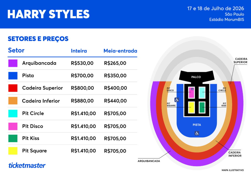 O espaço foi dividido em oito setores, tendo o mais exclusivo deles o Pit, que fica em frente ao palco e conta com 4 pontos, o Pit Circle, Pit Disco, Pit Kiss e Pit Square. Quem quiser ficar pertinho do ex-One Direction terá que desembolsar R$ 1.410,00 na inteira, ou R$ 705,00 na meia entrada.