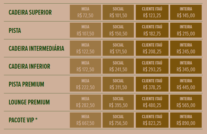 Os valores variam de R$ 72,50 a R$ 890 no ingresso mais caro, o pacote VIP que conta com acesso à Pista Premium, bar exclusivo e um kit com itens especiais da turnê. Ao todo, a festa conta com seis setores, ocupando todo o espaço da Fonte Nova.