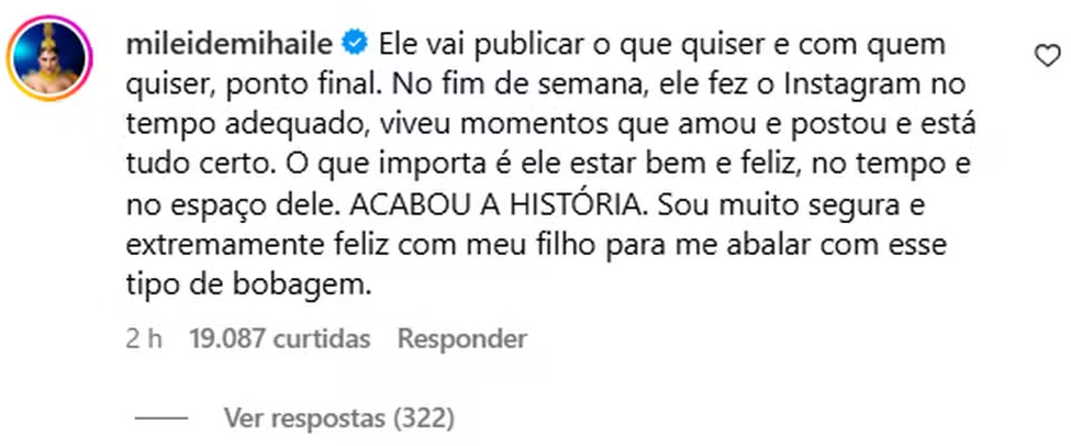 Mileide ainda afirmou que o que importa para ela é a felicidade do filho e não a picuinha criada pelos internautas.